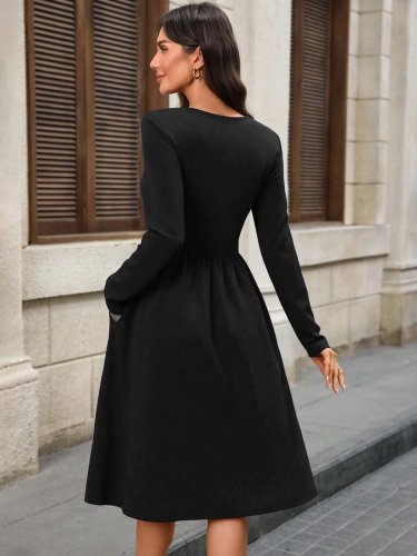 Kadın uzun kollu v yakalı cepli midi ithal krep elbise